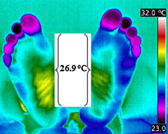 在糖尿病組中,平均皮膚溫度低于正常區(qū)域的身體部位,隨著HbA1c升高,皮膚溫度降低。與HbA1c相比,紅外熱成像顯示的皮膚溫度可以在早期發(fā)現(xiàn)糖尿病。皮膚溫度下降可能是由于基礎(chǔ)代謝率下降,血液灌注不良和胰島素抵抗高所致。足部熱像圖提供的早期體征可以用作檢測正在發(fā)展為糖尿病受試者的個體和處于疾病早期階段的個體潰瘍的有效預(yù)后工具。影響下肢的并發(fā)癥是糖尿病最常見的表現(xiàn),嚴重可能會導(dǎo)致截肢。而紅外成像可提供精確的截肢水平,從而避免了常規(guī)方法中的截肢。